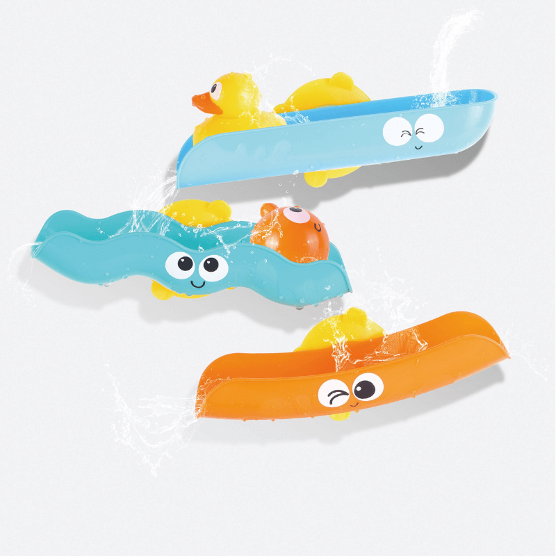 הצמידו בקלות את שלוש המגלשות הצבעוניות לדפנות האמבטיה או לאריחים, סדרו אותן בשיפוע, ושחררו את הברווזון והדגיג החמודים למסע מלהיב מלמעלה למטה! 🐠 ראו איך המים זורמים ממגלשה למגלשה וסוחפים איתם את הדמויות המתוקות.