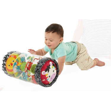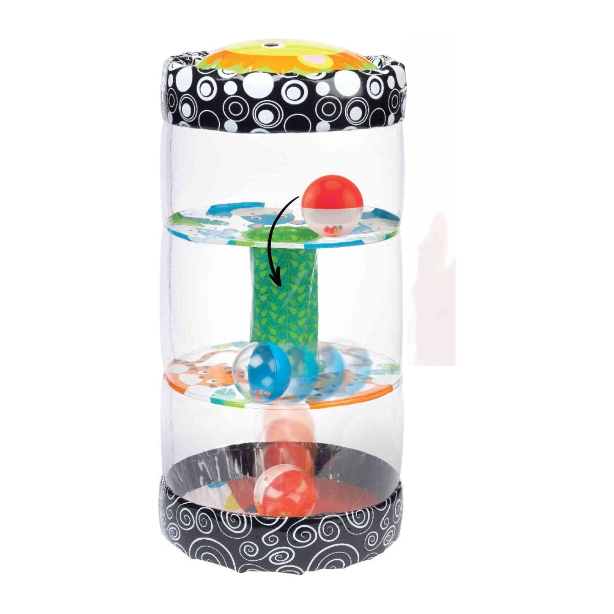 הגליל הצבעוני מעודד את הפעוטות לפעולת זחילה ומאתגר אותם בהעברת הכדורים דרך הצינור שבין המחיצות.